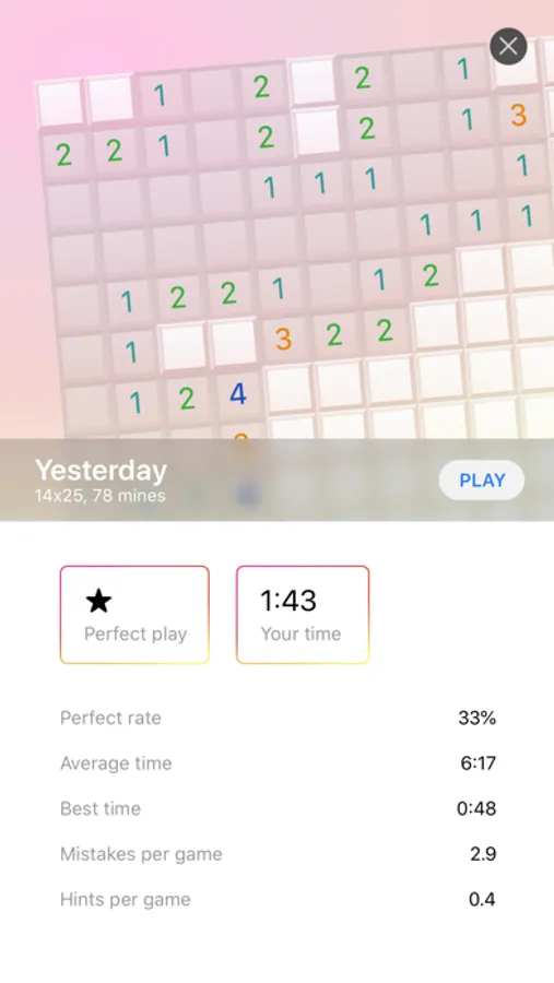 The main statistic tracked in Mineswifter is the perfect game, which is a board completed without mistakes or hints. Try to beat your longest perfect streak or your average time!