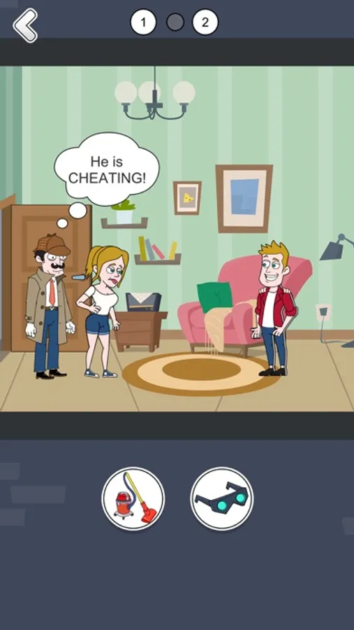 Each level presents you with multiple choices - make the right answers to catch the cheater. Wrong answers will result in misery for your client. So sad.