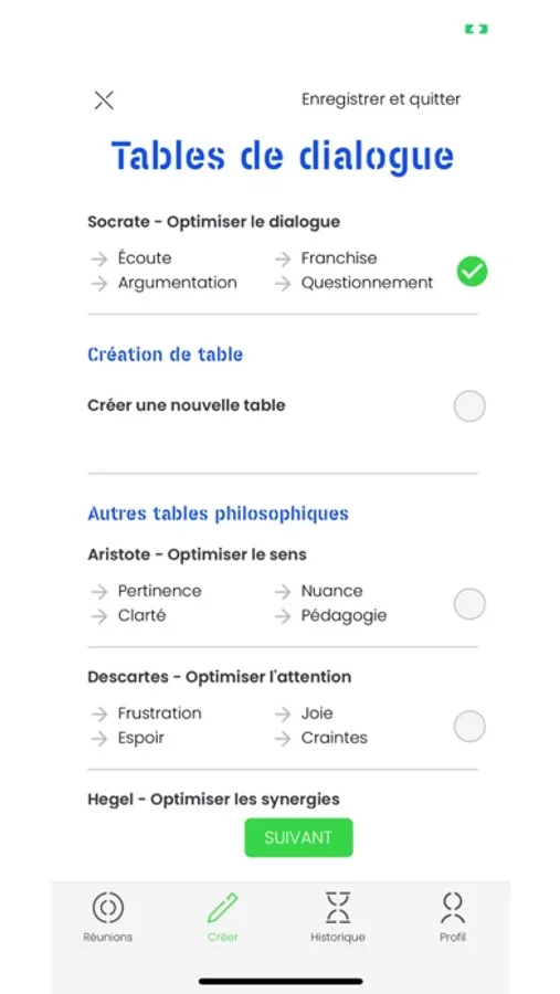 Au cœur de l’application, vos valeurs et celles des grands penseurs qui nous ont précédées. Avec Metagora, vous ferez de vos valeurs des outils opérants : elles guideront et nourriront vos échanges par des exercices de métacommunication permettant un niveau de feedback élevé.