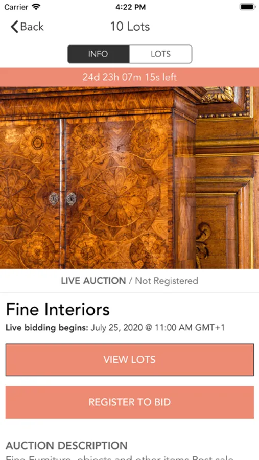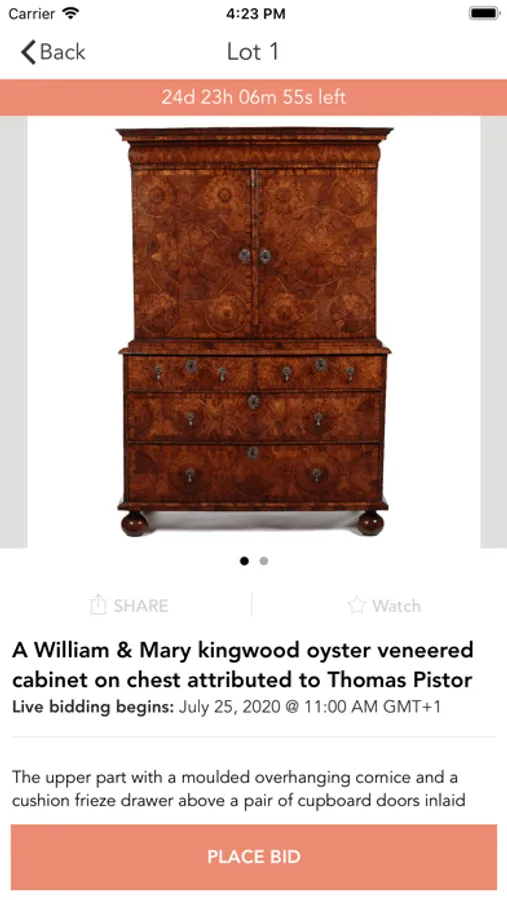 The Pedestal, founded in 2016 by a team of senior London specialists, hold auctions of selected Antiques, Fine Art, Silver and Luxury Accessories. The Pedestal's auctions take place in various premium locations, including Knightsbridge, London, Moor Park Mansion in Hertfordshire and in the Cotswolds. Our specialists work with a wide variety of collectors, dealers, decorators and curators from across the globe and are always aware of the latest market trends having extensive contacts in many fields. Furniture and Interiors are a particular speciality and the auctions include a wide variety of furniture from 16th-21st centuries. Expertise in the dispersal of collections has led to The Pedestal offering for auction the collection of the late William Stokes, a leading dealer and connoisseur of early furniture and Works of Art and the collection of the late Patrick Donald which included a notable collection of Japanese arms and armour and Works of Art. The Pedestal can offer suitable advice to both buyer and sellers of art and antiques and connect them to the international market. With the The Pedestal Auctions app, you can preview, watch and bid in our auctions from your mobile / tablet device. Participate in our sales while on-the-go and gain access to the following features: •Quick Registration •Following upcoming lots of interest •Push notifications to ensure you engage on items of interest •Track bidding history and activity •Watch live auctions