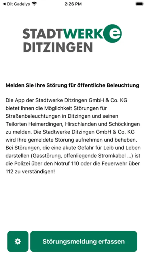 Melden Sie Störungen der Straßenbeleuchtung bei den Stadtwerken Ditzingen. Diese App ermöglicht es den Bürgerinnen und Bürgern Ditzingens einfach und schnell Störungen zu melden. Eine defekte Straßenlaterne kann mithilfe der App positionsgenau an die Stadtwerke Ditzingen übermittelt werden. Über den aktuellen Stand der Störungsbehebung werden Sie bequem per Mail oder App auf dem Laufenden gehalten.