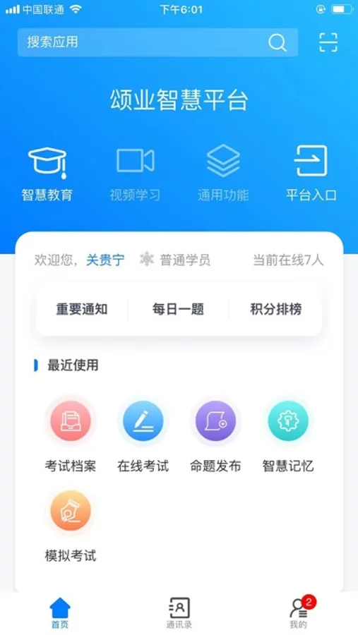 2、个人自学——个人可通过每日一题、顺序刷题、智慧记忆、模拟考试、在线考试、通知、资讯等多种方式学习、积分。