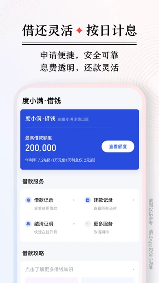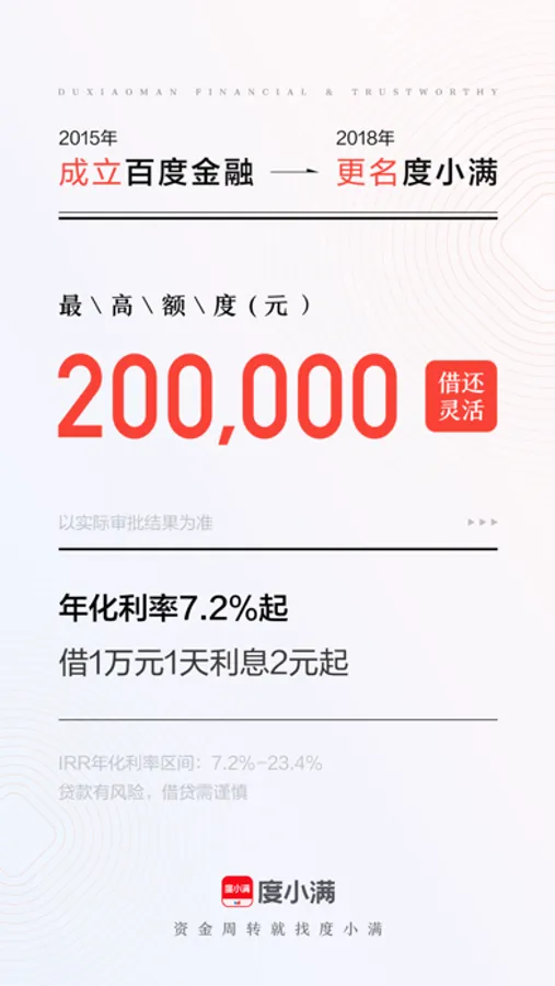 借贷有风险,选择需谨慎。具体贷款利率、额度、期限以实际审批为准(年化利率区间7.2%-24%),资金来源:重庆度小满小额贷款有限公司及合作金融机构。