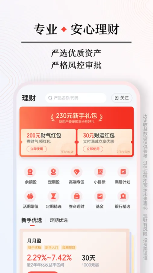 甄选持牌金融机构,严格筛选金融产品,覆盖多种金融产品种类,满足不同期限、不同风险偏好的投资需求。
