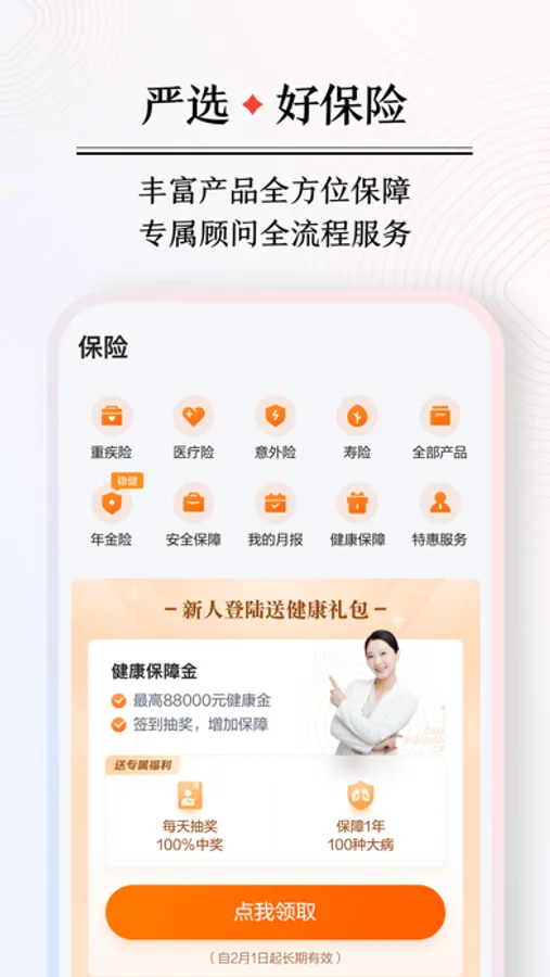 作为新用户,您有机会参加我们的「新人健康大礼包」活动!在保险页面,轻松点击“立即领取”按钮即可进入活动页面。此次活动为首次开通保险业务用户专属,让您的健康保障更加贴心。