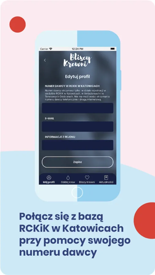 *By mieć dostęp do wszystkich funkcji aplikacji, niezbędna jest rejestracja dokonywana w oparciu o numer dawcy. O numer ten możesz poprosić personel w dowolnym punkcie krwiodawstwa przynależącym do Regionalnego Centrum Krwiodawstwa i Krwiolecznictwa w Katowicach.