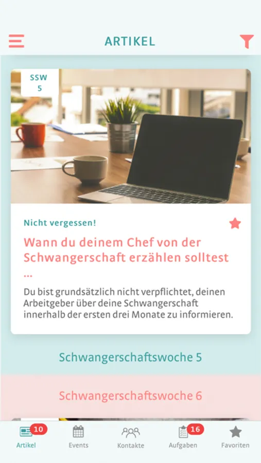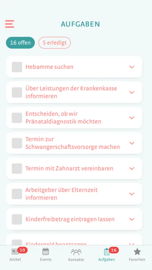 Bei so vielen Informationen und Aufgaben schwirrt der Kopf. Neben Dingen, die ihr für euch selbst und euer Baby tun solltet, stehen auch organisatorische Aufgaben auf dem Zettel. So müsst ihr bspw. zu gegebener Zeit euren Arbeitgeber informieren. Damit ihr nichts vergesst, findet ihr in der Babybauch-App die nötigen To Do´s im jeweiligen Trimester und könnt diese ganz bequem in eurem persönlichen Bereich hinterlegen. So habt ihr alles gut im Blick und könnt nach und nach abhaken, was ihr schon erledigt habt.