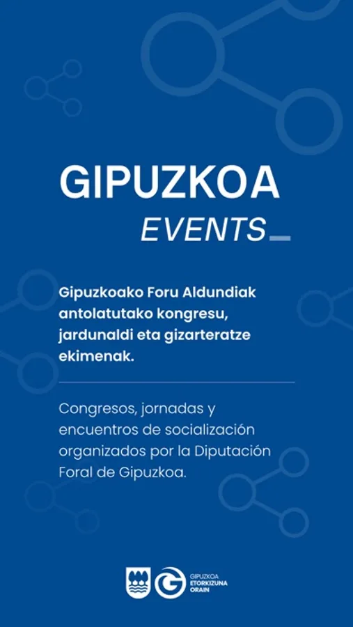 Descárgate la aplicación y accede con un sólo click a los congresos, jornadas y encuentros de socialización que organiza la Diputación Foral de Gipuzkoa: programas, inscripciones, eventos virtuales, networking, documentación y mucho más.