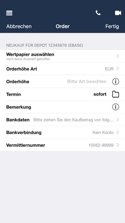 - Einreichung von Orderaufträgen direkt über die App, Bestätigung per Kennwort oder digitaler Unterschrift