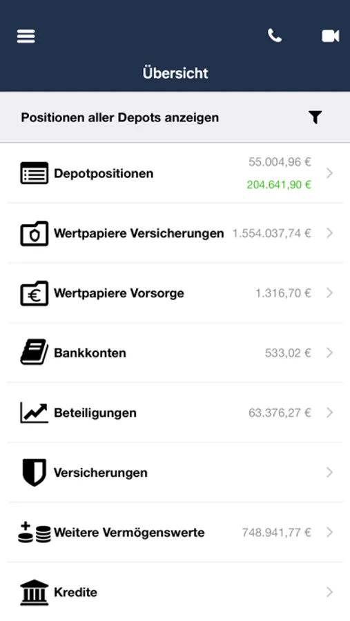 - Konsolidierte Vermögensübersicht inkl. aller Fondsanteile, Versicherungen, Beteiligungen und Bankkonten