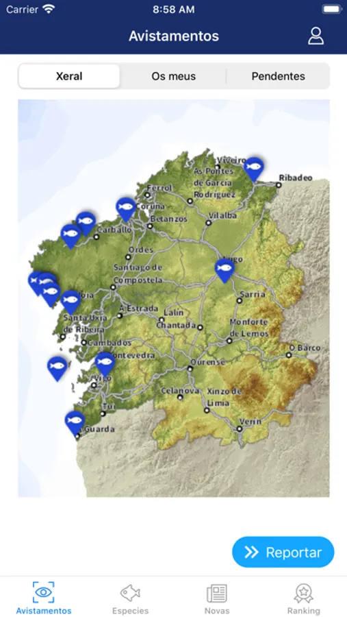 Calquera persoa de forma anónima ou ben rexistrándose pode reportar avistamentos desde a aplicación., Para iso, debe acceder a "Reportar avistamento", e encher o formulario dispoñible, cos datos que se solicitan. Os avistamentos recibidos serán revisado polos expertos e, no seu caso, engadidos ao mapa de avistamentos.