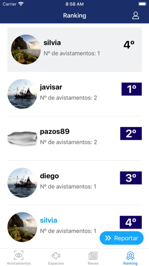 No caso de persoas rexistradas terá acceso á sección "Os meus avistamentos", onde poderá visualizar os avistamentos que enviou e coñecer cal é posición que ocupa no ránking.