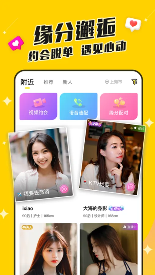 这是一款同城交友聊天约会软件,为同城附近陌生单身男女量身定制的聊天交友约会社交平台,在这里,你可以语音聊天、视频约会、征婚恋爱、找对象处cp,匹配有趣灵魂,让同城陌生人更容易遇见恋爱机会!全天在线聊天撩妹,分享生活点滴,找找附近陌生人,聆听彼此语音,聊开心就线下约会。遇见单身异性,来一场甜甜的交友之旅,一起脱单。
