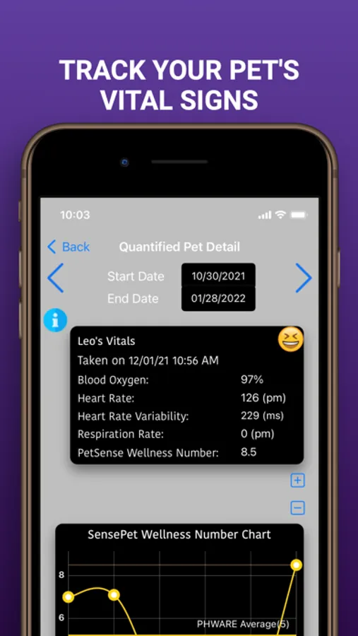 · Quantified Pet Dashboard provides comprehensive information about your pet's vitals and wellness.