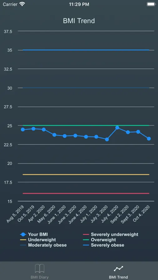 Visualization changes of your BMI values make it easier for users to monitor BMI trends in real-time. Manage your weight and health from BMI Diary!