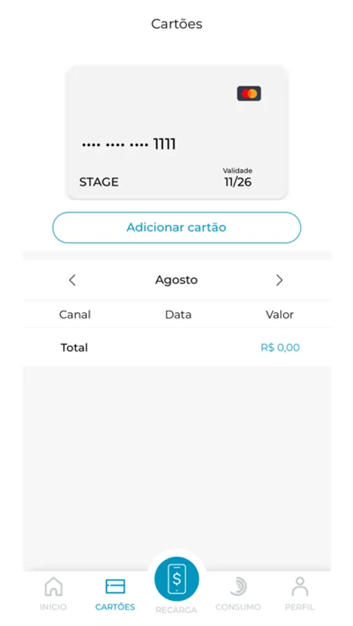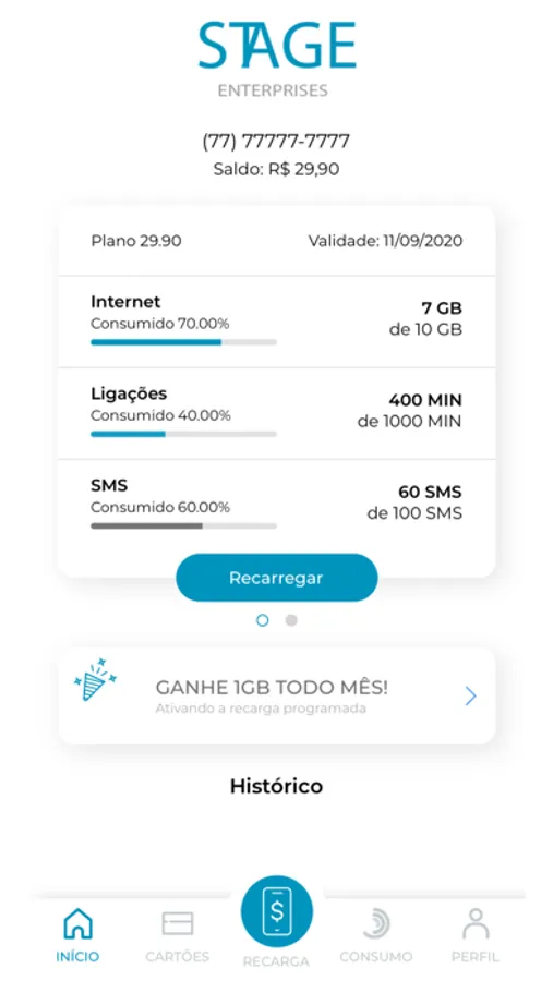 - Histórico das recargas realizadas online (aplicativo, site Stage Enterprises e por SMS).