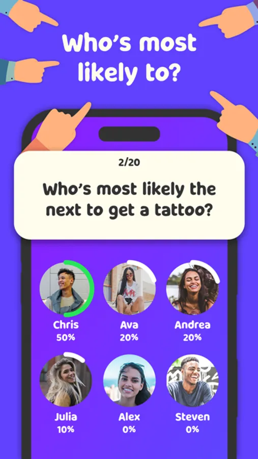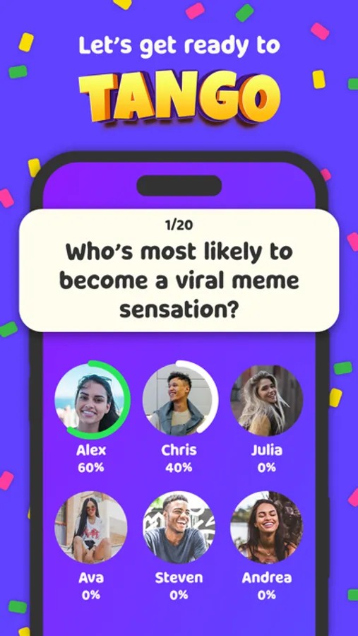 Welcome to Tango, the ultimate «Who's Most Likely To» experience that promises endless laughs, friendly banter, and amusing revelations. Just gather your crew and play!