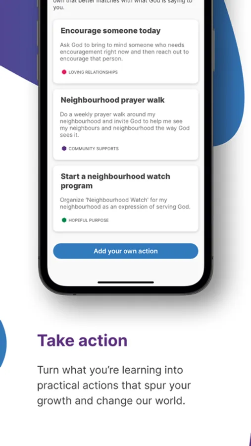 Every new insight you gain from a message or through engaging with a Cause can instantly turn into practical action. You can track how challenging these actions are. Tag each action to a specific area of your life so that over time you can see how you are challenging yourself in the different areas of your life.