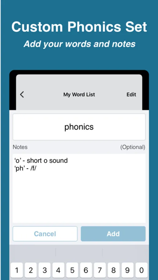 Phonics Cards is easy to use. You can create your own phonics set, add words and notes.