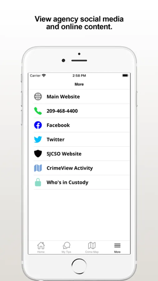 The SanJoaquinCo Sheriff app provides citizens the ability to submit anonymous tips to the San Joaquin County, CA Sheriff's Office. The app also displays agency crime alerts, online crime map, and other organization web and social media content.