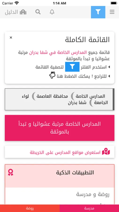 يساعدك تطبيق شمسية على استعراض كافة المدارس ورياض الأطفال الأهلية في منطقتك ويظهر لك نتيجة تقييم هذه المدارس إلى جانب عناوينها الصحيحة و مواقعها على خريطة جوجل ومعلومات تفصيلية عنها.