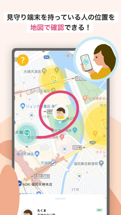 学校や公園、電柱や自動販売機、コンビニなどの地域のお店に整備した固定の見守りスポットと、見守り人アプリをインストールしたスマートフォンを持つ人やタクシーによる動く見守りスポットにより、子どもの位置を保護者の方にお伝えします。