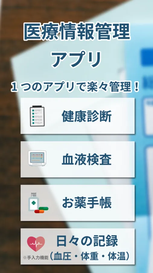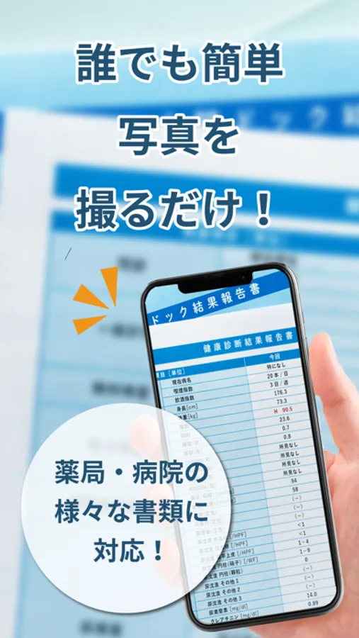 パシャっとカルテは健康診断や血液検査結果、お薬手帳などの医療情報をかんたんに管理できるアプリです。写真で撮るだけでデータ化されるため、誰でも利用することが可能です。