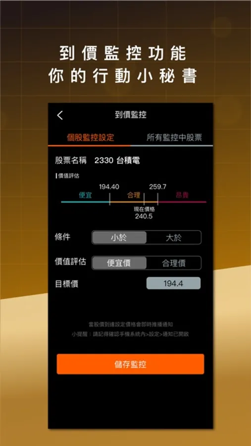 選擇看好的個股、點擊監控功能、設定心中目標價,等待到價通知就是這麼簡單!不需每天盯盤,長線投資、個股佈局,你需要的都在算利方程式。