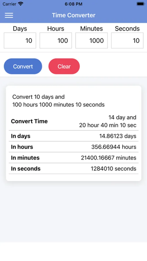 The entered time is displayed in day/hour/minute/second, converted to days, converted to hours, converted to minutes, or converted to seconds.