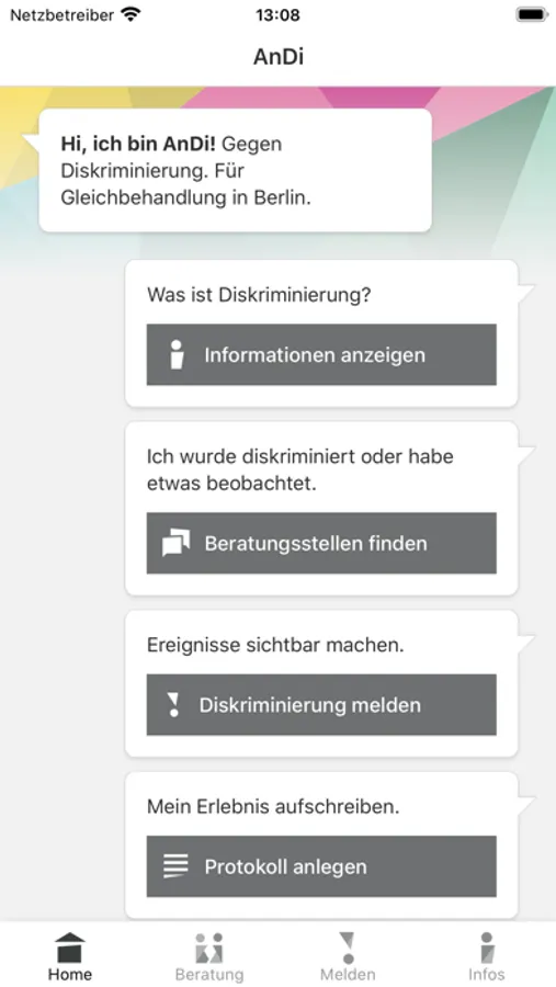 AnDi ist die Antidiskriminierungs-App des Landes Berlin. Mit dieser App kannst du dich rund um das Thema Diskriminierung und Gleichbehandlung informieren. AnDi hilft dir, eine passende Berliner Antidiskriminierungs-Beratungsstelle zu finden. In Berlin kannst du mit der App auch Vorfälle von Diskriminierung melden, egal, ob du selbst betroffen bist oder diese beobachtet hast.