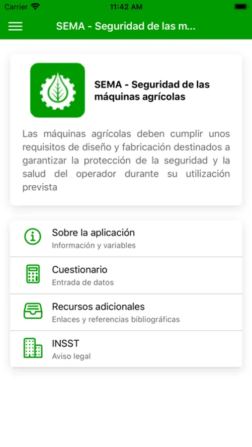 La aplicación permite la comprobación de las condiciones de seguridad durante la utilización de diferentes categorías de máquinas agrícolas mediante un cuestionario basado en los requisitos establecidos por la Directiva 2006/42/CE (Real Decreto 1644/2008) y las normas armonizadas pertinentes.