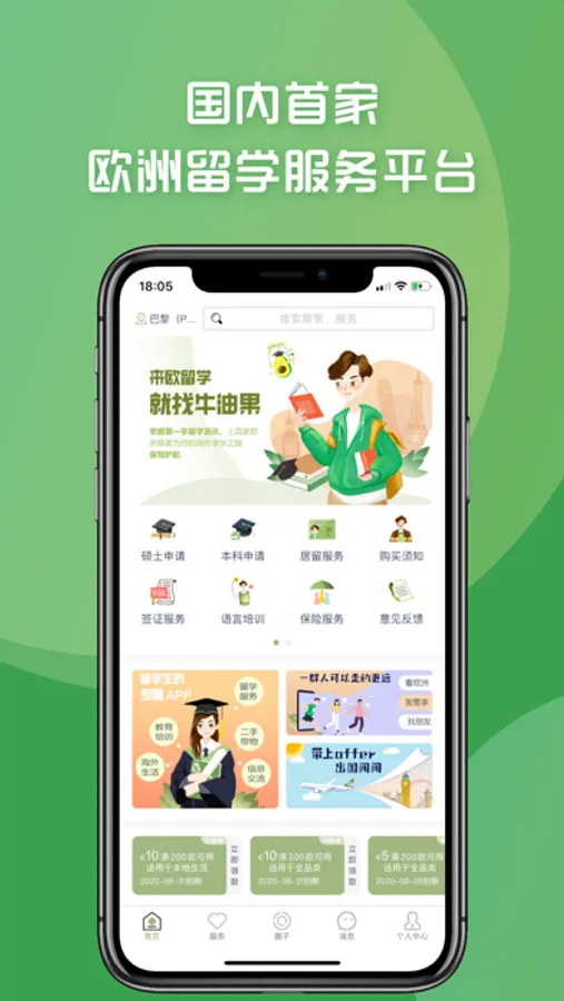 • 国内外首家专注欧洲留学生学习和生活的集成型一站式服务平台。牛油果留学平台出售的不仅仅是实体产品还有专业的服务(留学服务/教育培训/本地生活),所有和留学生活相关的服务你都可以在app内轻松找到。