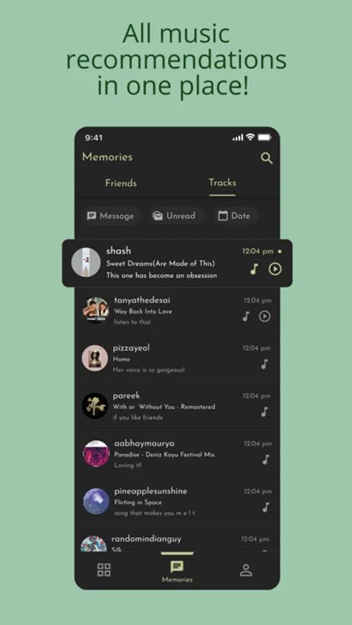 3. Social Playlists. Each group automatically becomes a playlist. No need to sift through links and find tracks, just tap a button and you have a curated mix just for you.