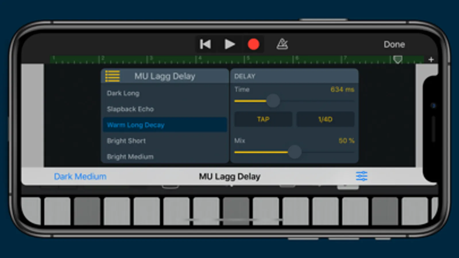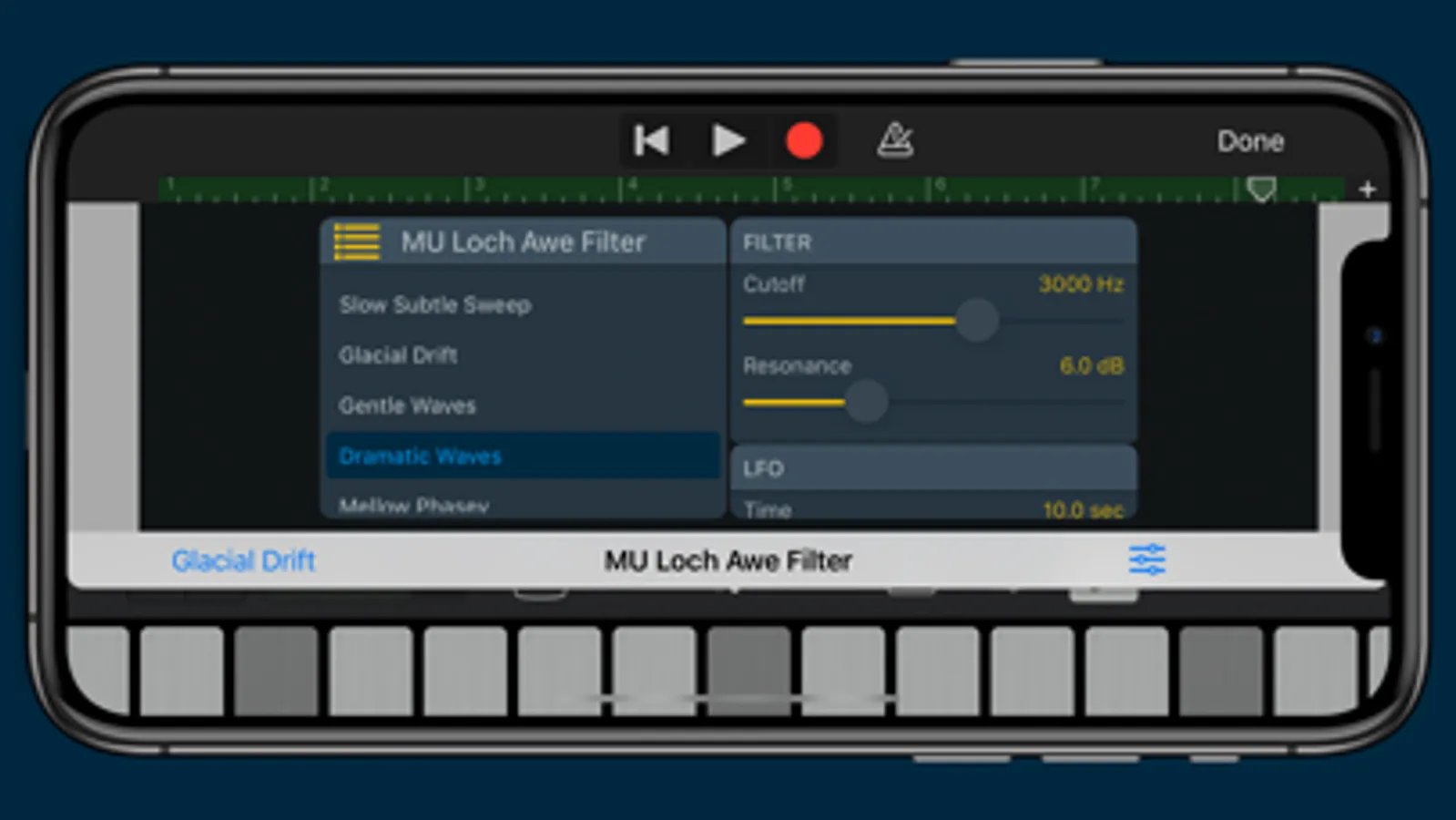 moodunits also comes with some basic effects, allowing you to create a great sounding musical project using just moodunits and your favourite AU host. In keeping with the moodunits design principal, the effects are light on CPU and expose a few essential parameters. They're probably not going to replace your favourite bells and whistles mega reverb or delay, but their simplicity might come as a refreshing change. Currently these effects include a delay, reverb, low-pass filter, 10-band EQ, peak limiter and distortion.