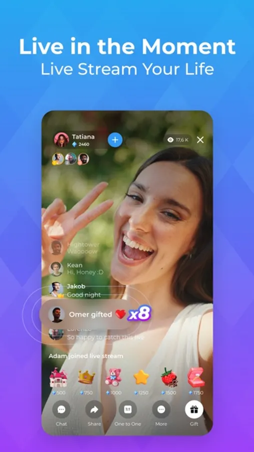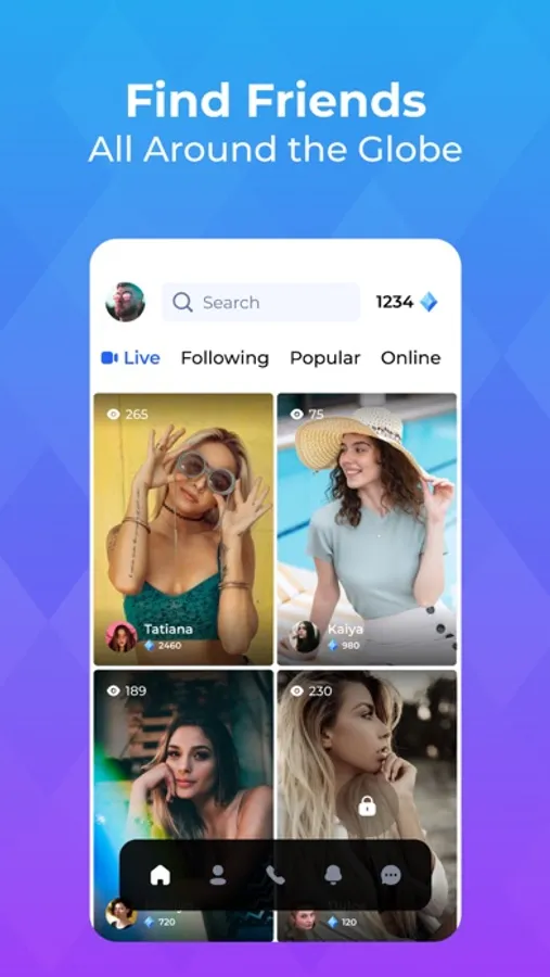Join the most entertaining live streams from around the globe and participate in the show. Meet with new people online and improve your social circle. Follow each other, send messages and gifts, and talk to each other. Explore new communities and multiply the fun!