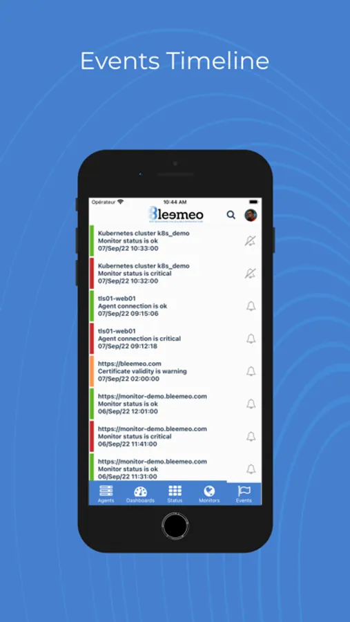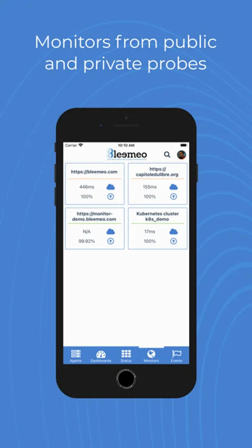 Bleemeo offers a complete Cloud monitoring solution. The mobile application offers a synthetic view of your infrastructure and allows you to be informed of any problem on your infrastructure in real-time.
