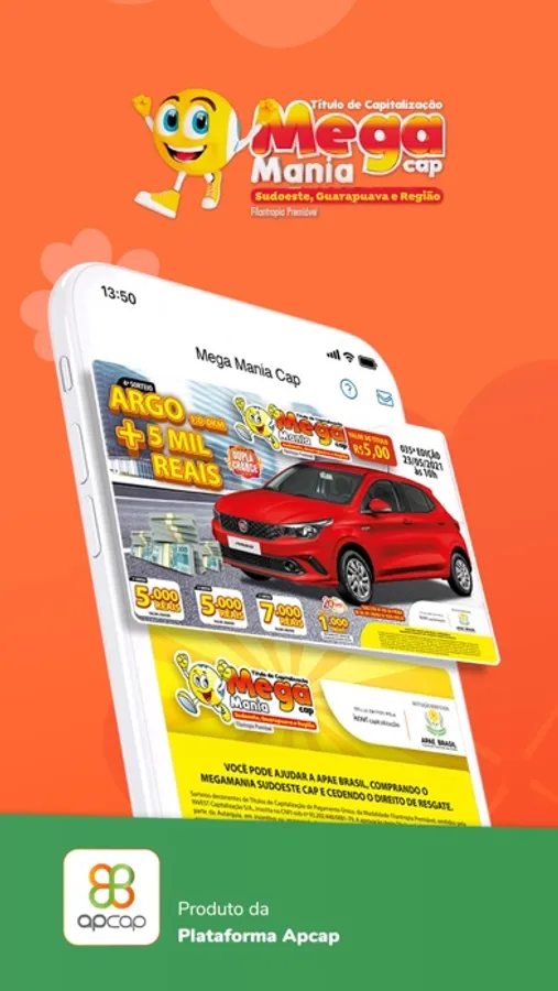 O MEGAMANIA CAP Sudoeste é um Título de Capitalização de Pagamento Único, da Modalidade Filantropia Premiável, com atuação no Paraná, aprovados pela SUSEP e emitidos pela KOVR CAPITALIZAÇÃO S.A (CNPJ nº 93.202.448/0001-79). Além de proporcionar o direito de participação em sorteios ao subscritor, com o MEGAMANIA CAP Sudoeste você pode contribuir para o desenvolvimento e custeio da APAE Brasil, através da cessão do direito de resgate do seu Título, gerando recursos que serão investidos na prestação de serviços de assistência nas diversas atividades da instituição. Conheça mais sobre o trabalho e os projetos da APAE Brasil no site: www.apaebrasil.org.br.