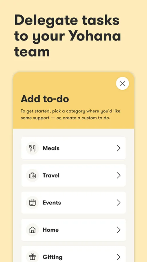 • Hand things off to your Yohana team. Easily delegate tasks to your Yohana Team via the desktop or mobile app. Choose from one of our featured to-dos, find tasks by category, or create a custom to-do of your own.