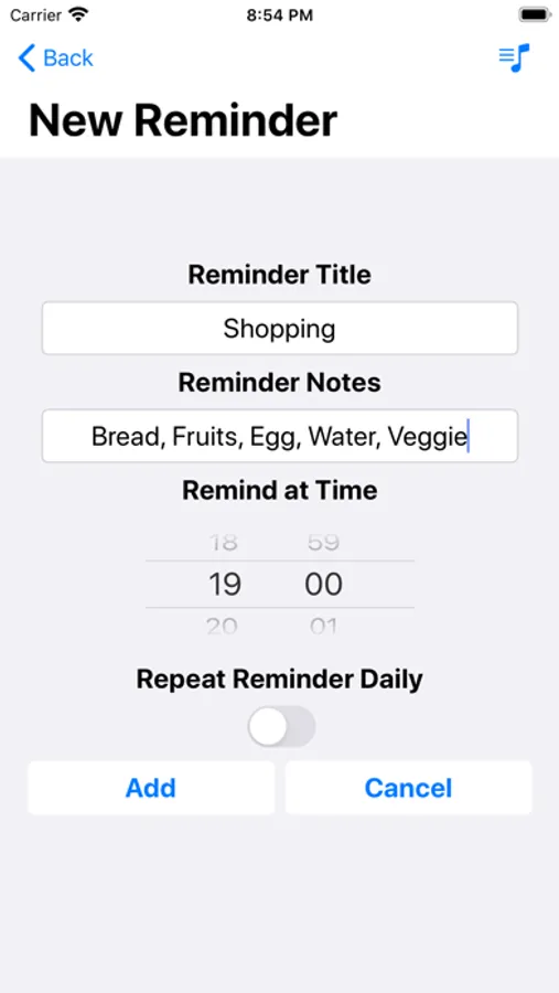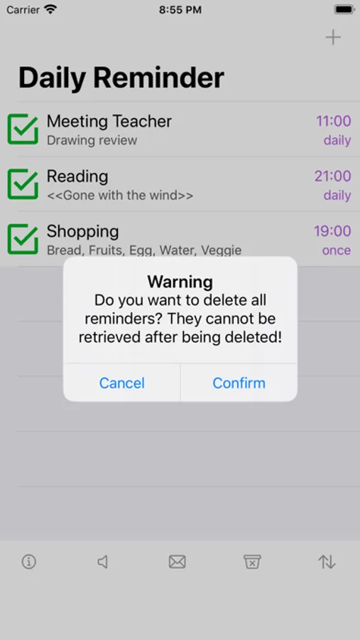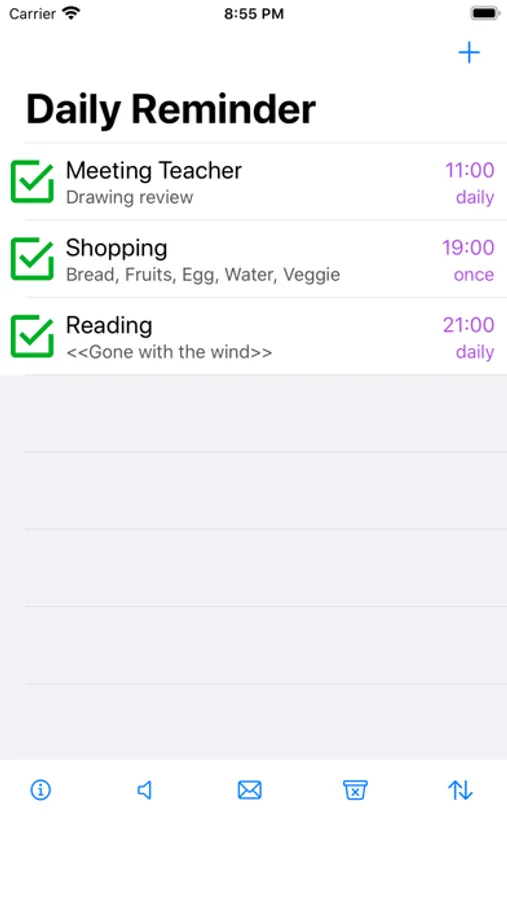 "+" add button - enter the page to create a new reminder.