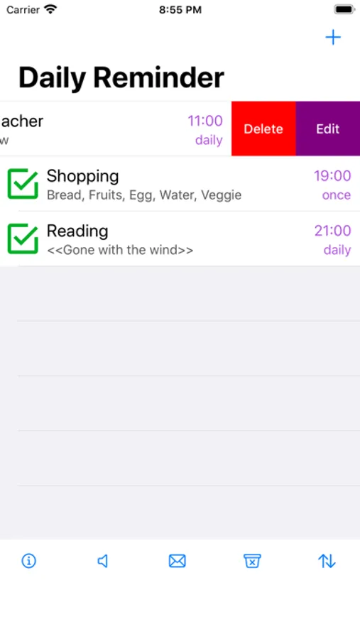"Delete" - right swipe a reminder in list can allow user to delete the swiped reminder.