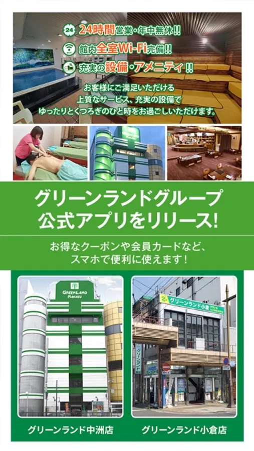 福岡の中洲と小倉にある サウナ&カプセル『グリーンランドグループ』の公式アプリです。