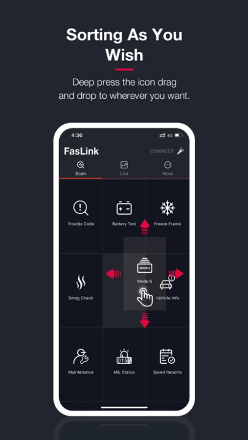 FasLink X app connect to the compatible OBDII sensors via Bluetooth 4.0 and above, just run the FasLink X app and tap "CONNNECT", then select the OBDII sensor in the list, tap to build connection.