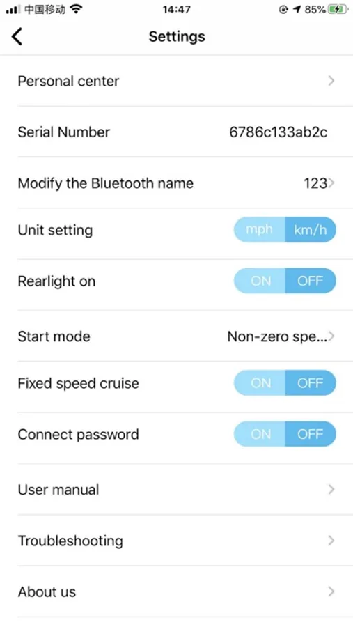 Check the real-time running data and status of the electric scooter, and set the running parameters of the APP; Monitor scooter status. Through the Bluetooth connection of the mobile phone and the device, the main interface can see the real-time speed of the scooter, the mileage of a single ride, the total mileage of the ride, the switching on/ off status of the headlights, whether the scooter is locked, etc.