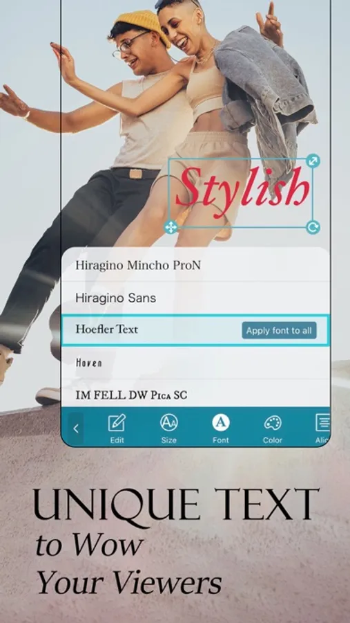• Font – Access 100+ different fonts to customize your creative output.