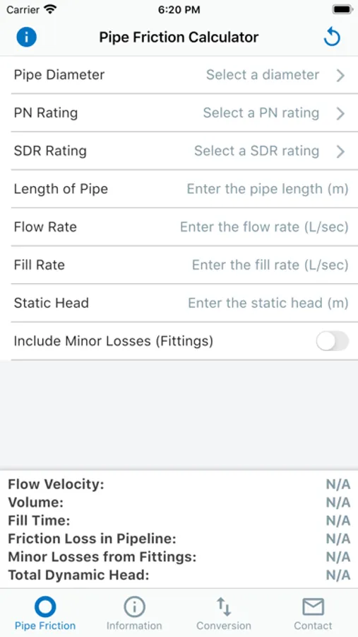 • Real-time Pipe Friction Calculator, including Minor Losses toggle for PE100 HDPE Pipe.