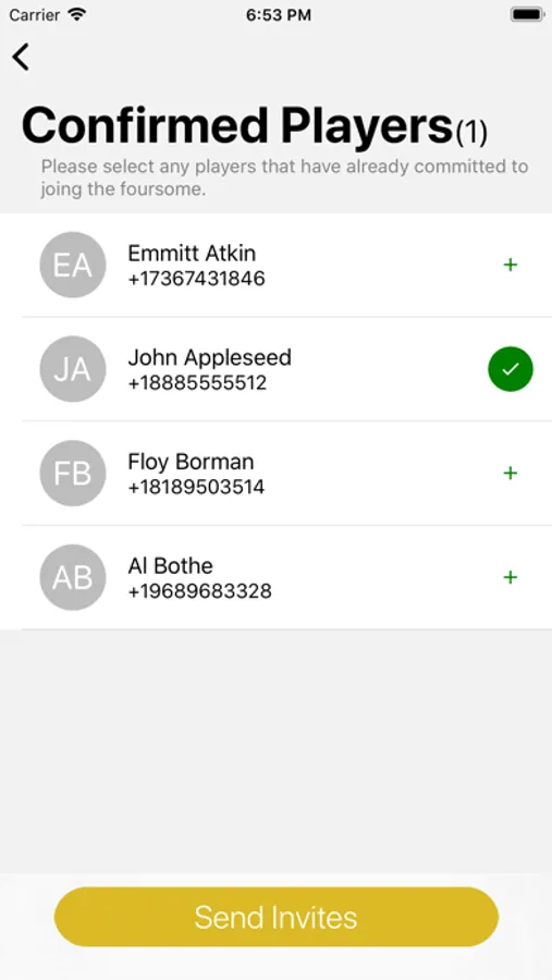 Foursome Golf. More Golf…Less Grief. Our app will make the process easier for you when trying to get your friends together to play golf. No one likes to be the person who puts the group together – whether long email threads or aggravating group texts – the process right now is cumbersome and annoying. Foursome Golf solves that problem. Simple to use: just enter your tee time; touch the names of those you want to invite and hit send. Foursome Golf then interacts with everyone on your invite list based on their responses. We keep you updated as your invited friends respond as well as updating the entire group. So while you are working or doing something fun besides playing golf, Foursome Golf is working full-time to get your tee time filled with players that you choose.