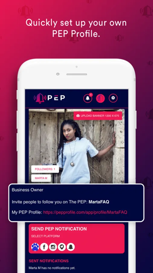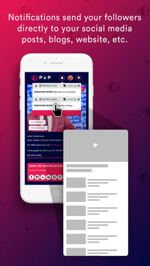 1) The PEP is a notification app. In simpler terms, it is a modern day pager that lets your followers know when you post to your favorite social media platforms.