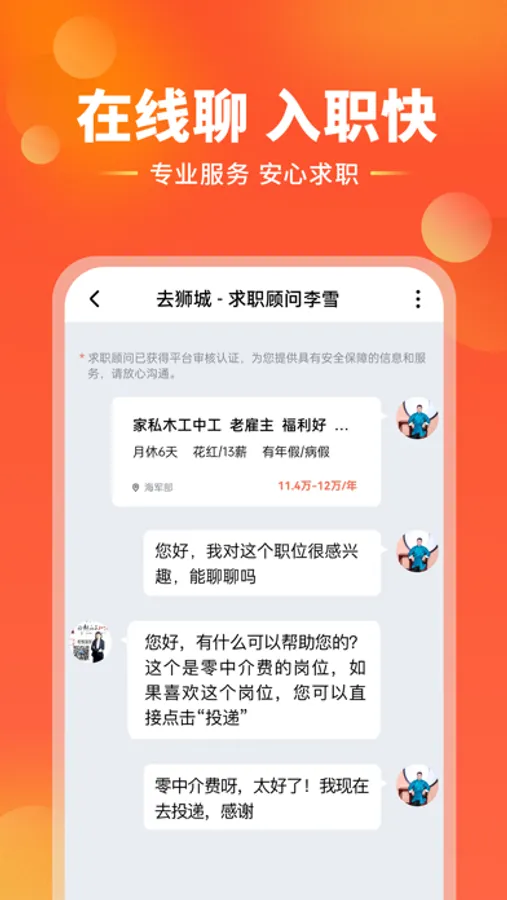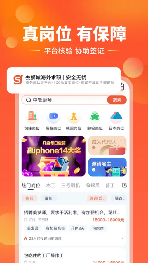 "真实岗位无套路"。去狮城是一款低收费新加坡劳务派遣应用程序,面向中国、新加坡、马来西亚、印度、越南等劳务市场,依托大数据、AI等前沿互联网科技,整合专业求职顾问团队,在雇主与求职者两端建立开放、透明、公平、高效的职业匹配,助力求职者快速入职,平台保障信息安全、岗位安全、资金安全。