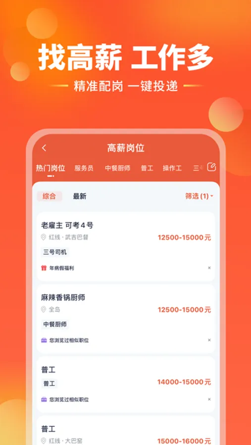 • 可选择薪资范围、福利待遇、岗位类型进行搜索