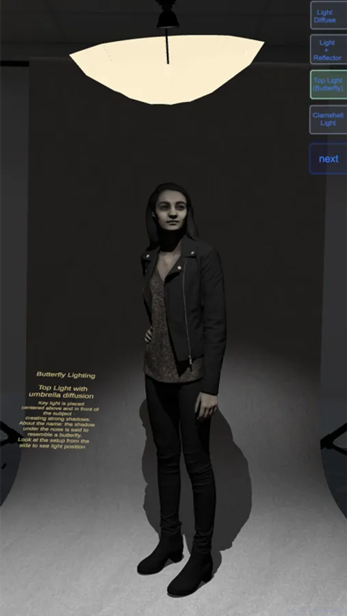 Using your iphone or ipad you can step into a Portrait Lighting Studio wherever you are. View a variety of Studio Lighting Setups in full size 3D. Learn the basics of portrait lighting using one light and a reflector or two light setups. This interactive app lets you move around the virtual studio and choose your point of view – study the light placement used to light the model or move in close to focus on the portrait.